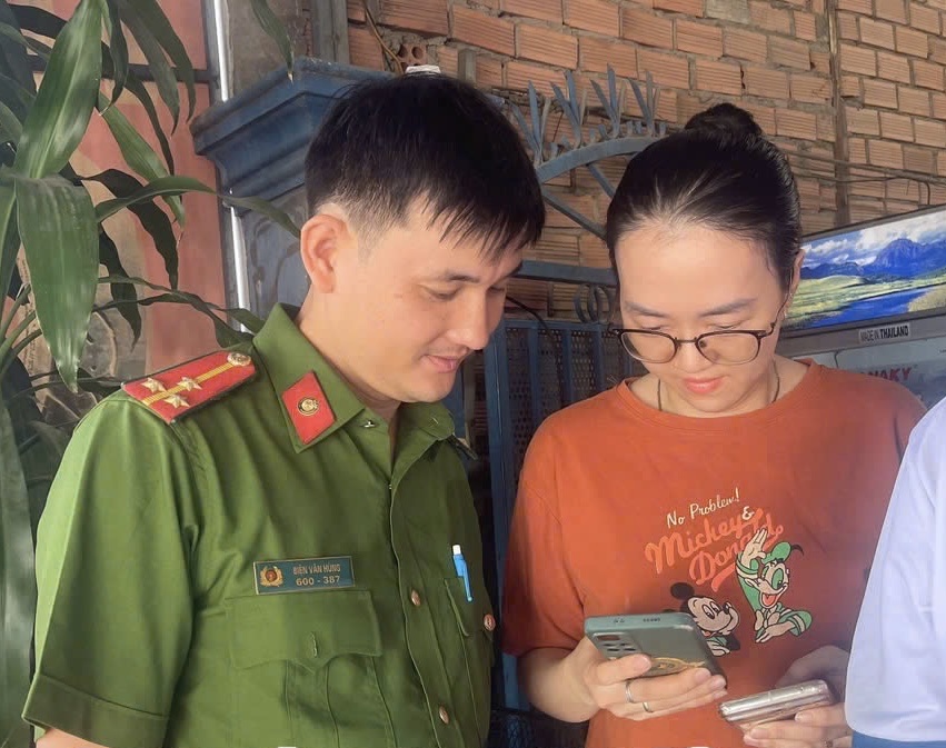 Chiến sĩ công an xã Nhơn Trạch đang tuyên truyền cho người về các thủ đoạn, và cách phòng ngừa tội phạm