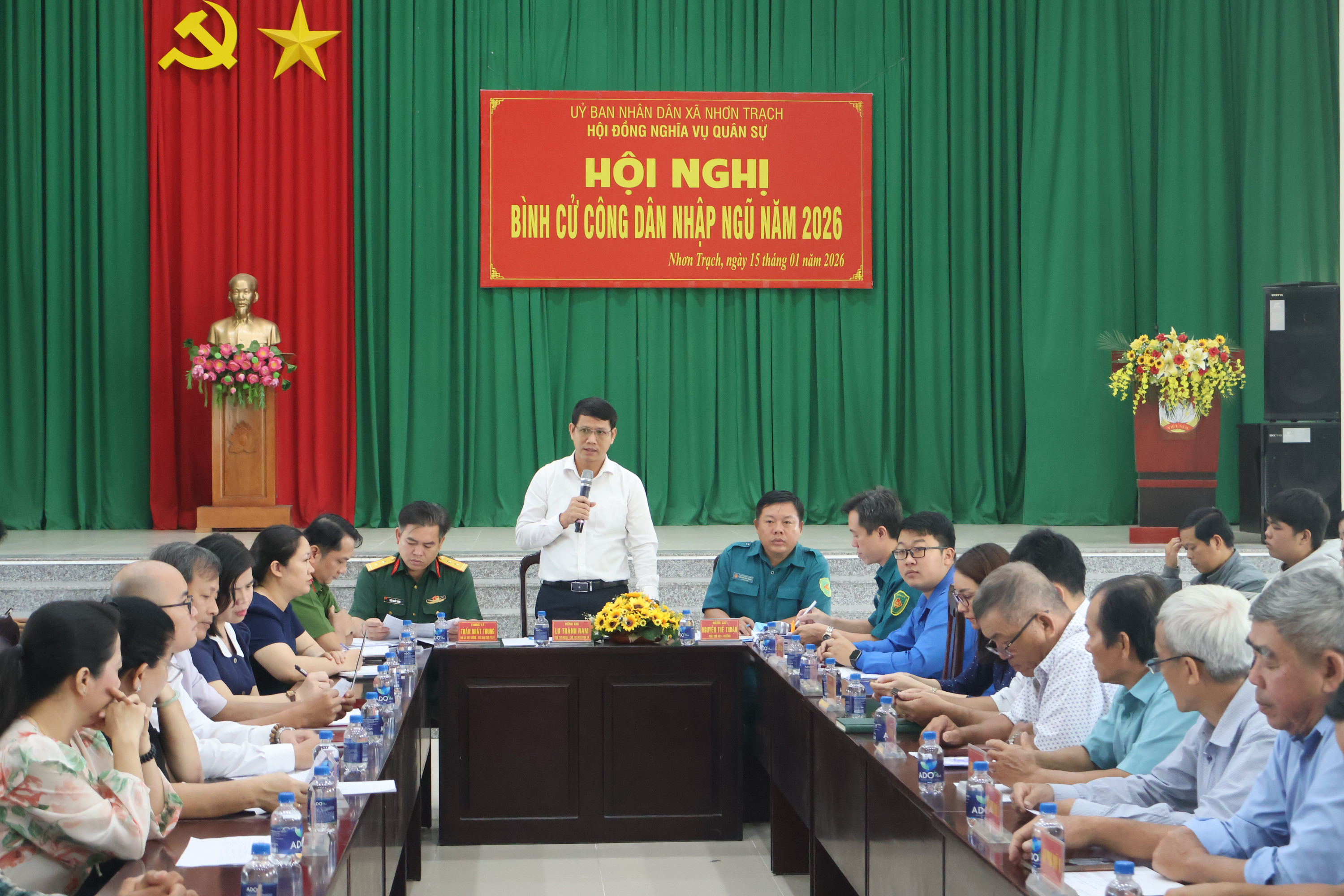 Phát biểu chỉ đạo tại hội nghị, đồng chí Lư Thành Nam - Phó Bí thư Đảng ủy, Chủ tịch UBND xã, Chủ tịch Hội đồng Nghĩa vụ quân sự xã ghi nhận và đánh giá cao tinh thần trách nhiệm của các thành viên Hội đồng Nghĩa vụ quân sự xã trong việc triển khai đầy đủ, chặt chẽ các bước tuyển chọn và gọi công dân nhập ngũ năm 2026. Đồng chí bày tỏ tin tưởng các thanh niên xã Nhơn Trạch sẽ tiếp nối truyền thống quê hương, phát huy tinh thần yêu nước, trách nhiệm của tuổi trẻ, sẵn sàng lên đường nhập ngũ, chấp hành nghiêm Luật Nghĩa vụ quân sự, góp phần xây dựng và bảo vệ vững chắc Tổ quốc.