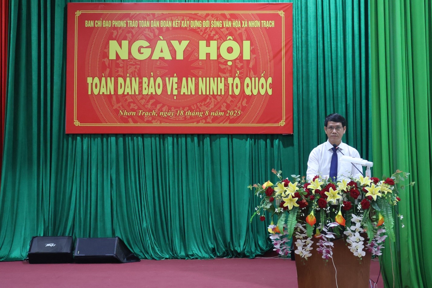 Tại buổi lễ, Trung tá Trịnh Anh Việt – Trưởng Công an xã đã ôn lại truyền thống vẻ vang của lực lượng Công an nhân dân qua 80 năm xây dựng, chiến đấu và trưởng thành (19/8/1945-19/8/2025) cũng như những kết quả, thành tích nổi bật qua 20 năm tổ chức Ngày hội Toàn dân bảo vệ an ninh Tổ quốc (19/8/2005- 19/8/2025). Đồng thời khẳng định, sau sáp nhập, Công an xã Nhơn Trạch từng bước đi vào hoạt động ổn định, không ngừng trưởng thành, lớn mạnh, thật sự là lực lượng nồng cốt, xung kích trong sự nghiệp bảo vệ an ninh quốc gia, giữ gìn trật tự an toàn xã hội, làm tốt công tác tham mưu Đảng ủy - UBND và phối hợp các ngành đoàn thể trong việc củng cố, nâng chất hoạt động của các chi, tổ, hội và các tổ chức quần chúng làm nòng cốt trong phong trào TDBVANTQ gắn với cuộc vận động “Toàn dân đoàn kết xây dựng nông thôn mới, đô thị văn minh”. Huy động sự tham gia của các ngành, Mặt trận Tổ quốc và các tổ chức chính trị - xã hội các cấp, thủ trưởng cơ quan, doanh nghiệp, cơ sở giáo dục và Nhân dân tích cực, tự giác tham gia phong trào toàn dân bảo vệ ANTQ góp phần xây dựng, củng cố nền an ninh nhân dân, thế trận an ninh nhân dân trên cơ sở thế trận lòng dân vững chắc trong kỷ nguyên mới, kỷ nguyên vươn mình của dân tộc.