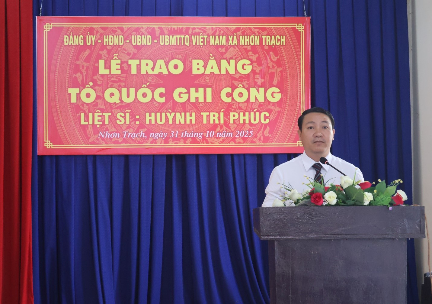 Sáng ngày 31/10/2025, Đảng ủy – HĐND - UBND - Ủy ban MTTQ Việt Nam xã Nhơn Trạch tổ chức Lễ trao Bằng “Tổ quốc ghi công” cho liệt sĩ Huỳnh Trí Phúc, tổ viên Tổ bảo vệ an ninh trật tự cơ sở, đã anh dũng hi sinh trong quá trình thực hiện nhiệm vụ.