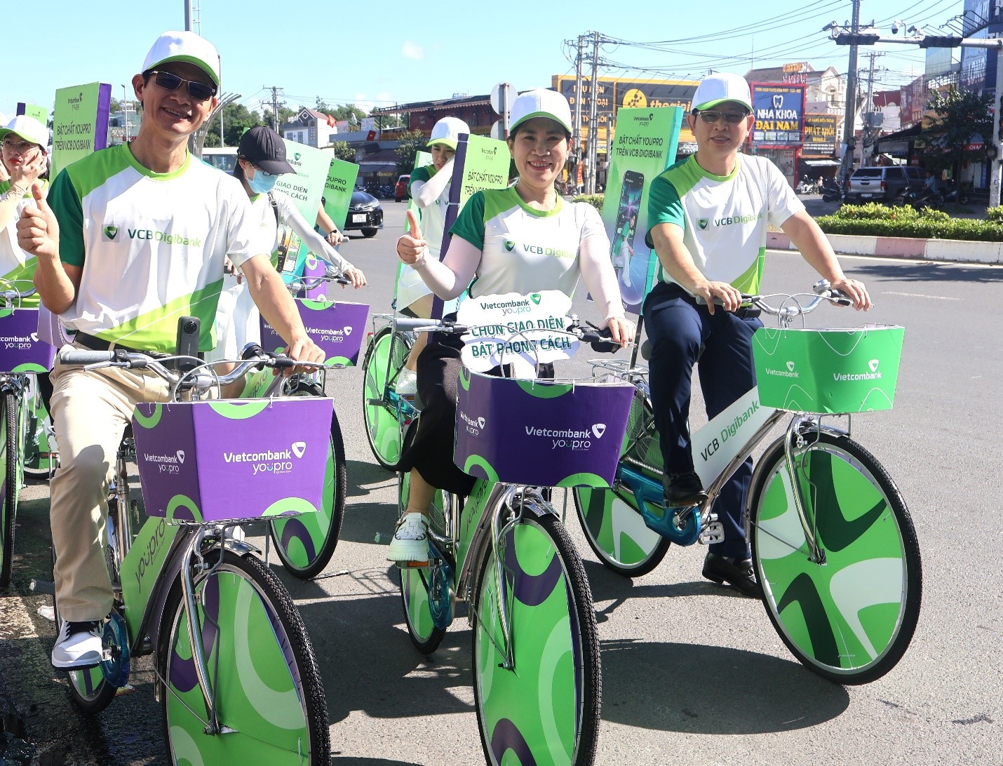 Lãnh đạo Vietcombank Nhơn Trạch tham gia diễu hành tuyên truyền về các sản phẩm số của Ngân hàng