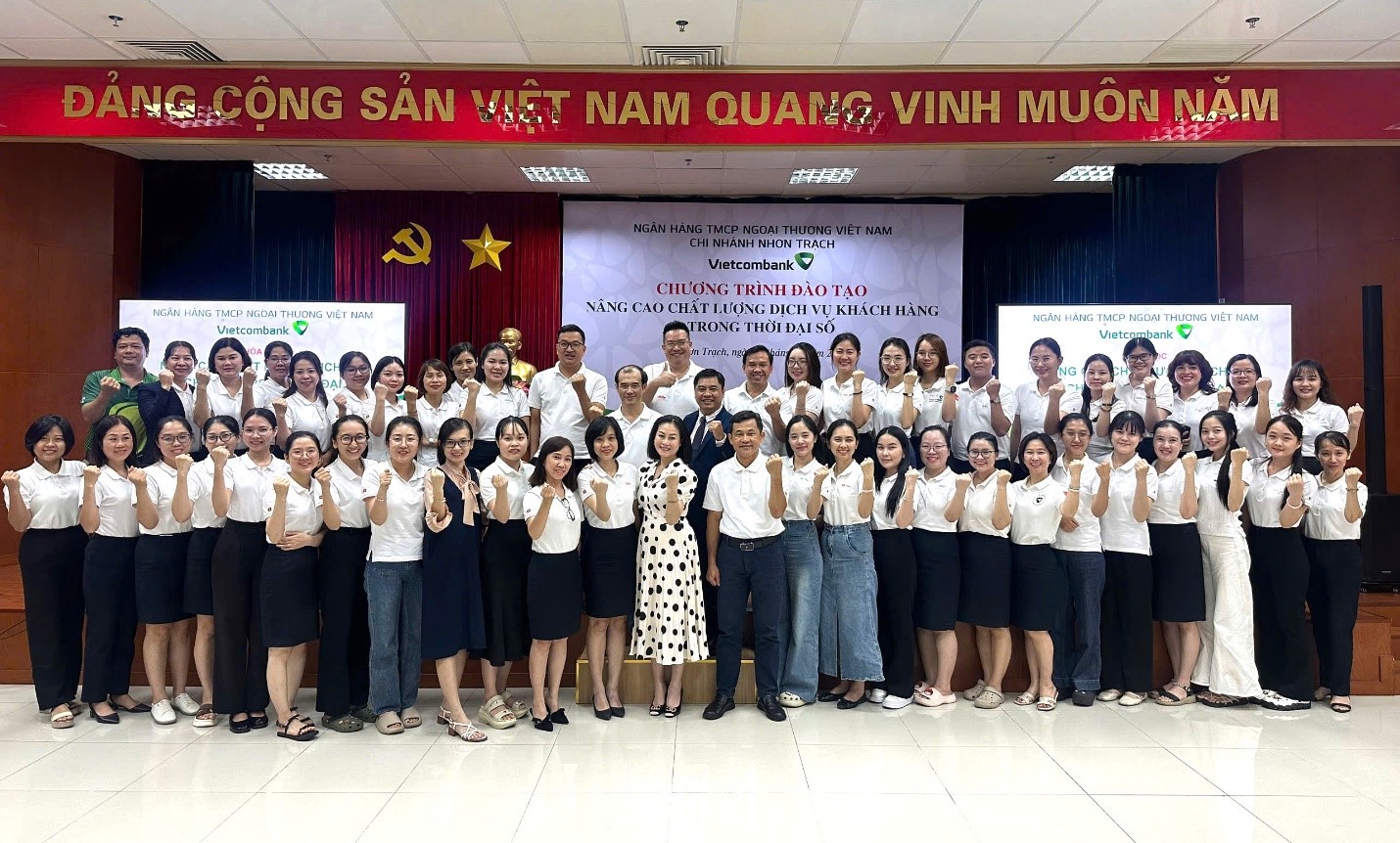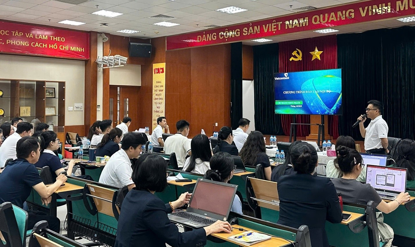 Quang cảnh buổi đào tạo nội bộ Vietcombank Nhơn Trạch về nâng cao chất lượng dịch vụ khách hàng trong thời đại số.
