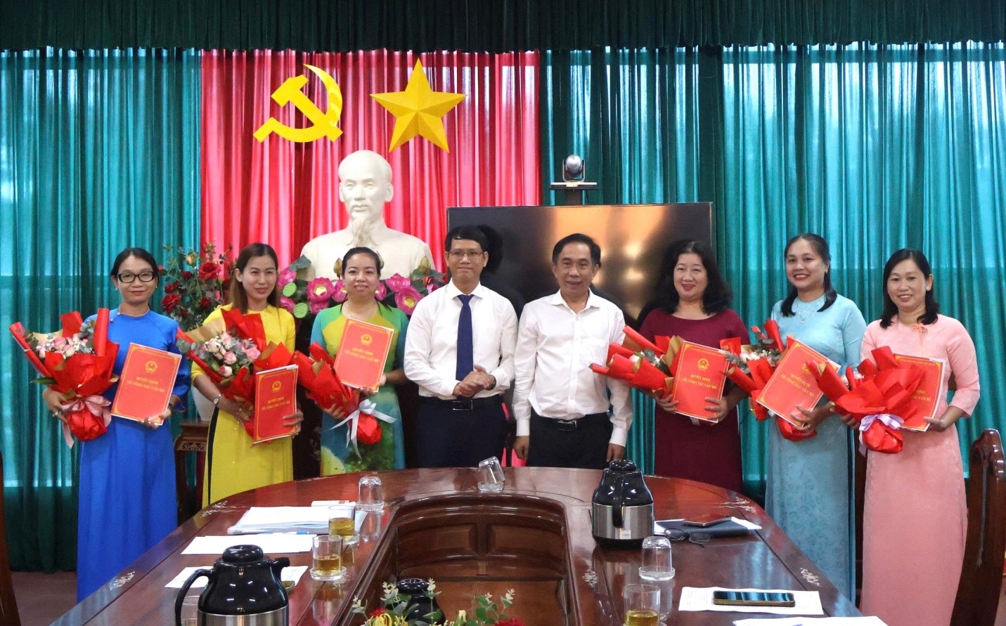 Lãnh đạo UBND xã trao Quyết định và tặng hoa chúc mừng cán bộ quản lý các trường học được bổ nhiệm lại