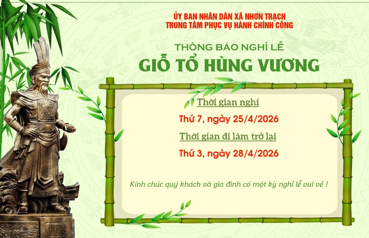 <figure class="image"><img style="aspect-ratio:1186/766;" src="https://nhontrach.dongnai.gov.vn/uploads/nhontrach/news/2026_04/thong-bao-nghi-le-gio-to-hung-vuong.jpg" width="1186" height="766" /></figure><p style="line-height:normal;margin:18.0pt 0cm 6.0pt;text-indent:1.0cm;"><span style="font-size:20px;"><span style="letter-spacing:-.1pt;">Căn cứ Thông báo số 273/TB-UBND ngày 24/4/2026 của UBND xã Nhơn Trạch về việc nghỉ Lễ Giỗ Tổ Hùng Vương (10/3 Âm lịch), ngày Chiến thắng 30/4 và ngày Quốc tế Lao động 01/5 năm 2026.</span></span></p><p style="line-height:normal;margin:6.0pt 0cm;text-indent:1.0cm;"><span style="font-size:20px;"><span style="letter-spacing:-.1pt;">Trung tâm Phục vụ hành chính công xã Nhơn Trạch thông báo đến các tổ chức, cá nhân cùng toàn thể cán bộ, công chức, viên chức, người lao động làm việc tại Trung tâm Phục vụ hành chính công xã Nhơn Trạch về lịch nghỉ Lễ Giỗ Tổ Hùng Vương năm 2026 như sau:</span></span></p><p style="line-height:normal;margin:6.0pt 0cm;text-indent:1.0cm;"><span style="font-size:20px;"><span style="letter-spacing:-.1pt;"><strong>1.</strong> Về thời gian nghỉ Lễ Giỗ Tổ Hùng Vương năm 2026: </span></span><span style="color:hsl(0,75%,60%);font-size:20px;"><span style="letter-spacing:-.1pt;"><strong>thứ Hai ngày 27/4/2026</strong>.</span></span></p><p style="line-height:normal;margin:6.0pt 0cm;text-indent:1.0cm;"><span style="font-size:20px;"><span style="letter-spacing:-.1pt;">Thời gian làm việc trở lại: Trung tâm sẽ tiếp nhận hồ sơ và trả kết quả thủ tục hành chính từ </span></span><span style="color:hsl(0,75%,60%);font-size:20px;"><span style="letter-spacing:-.1pt;"><strong>thứ Ba ngày 28/4/2026</strong>.</span></span></p><p style="line-height:normal;margin:6.0pt 0cm;text-indent:1.0cm;"><span style="font-size:20px;"><span style="letter-spacing:-.1pt;"><strong>2.</strong> Đề nghị công chức, viên chức, người lao động làm việc tại Trung tâm Phục vụ hành chính công xã Nhơn Trạch thực hiện dọn dẹp, sắp xếp hồ sơ ngăn nắp, vệ sinh khu vực làm việc, máy tính, bàn ghế, tắt nguồn các thiết bị điện trước khi nghỉ Lễ Giỗ Tổ Hùng Vương năm 2026; chấp hành kỷ luật, kỷ cương hành chính, giờ giấc làm việc trong thời gian trước và sau thời gian nghỉ lễ.</span></span></p><p style="line-height:normal;margin:6.0pt 0cm;text-indent:1.0cm;"><span style="font-size:20px;"><span style="letter-spacing:-.1pt;"><strong>3.</strong> Trung tâm Phục vụ hành chính công xã Nhơn Trạch trân trọng thông báo đến quý người dân và doanh nghiệp để thuận tiện trong việc liên hệ công tác, nộp hồ sơ và nhận kết quả giải quyết thủ tục hành chính trước và sau thời gian nghỉ lễ.</span></span></p><p style="line-height:17.0pt;margin:6.0pt 0cm;text-indent:1.0cm;"><span style="font-size:20px;"><span style="letter-spacing:-.1pt;">Trung tâm Phục vụ hành chính công xã Nhơn Trạch trân trọng thông báo./.</span></span></p><p style="line-height:17.0pt;margin:6.0pt 0cm;text-indent:1.0cm;">&nbsp;</p><p style="line-height:17.0pt;margin:6.0pt 0cm;text-align:right;text-indent:1.0cm;">&nbsp;</p>