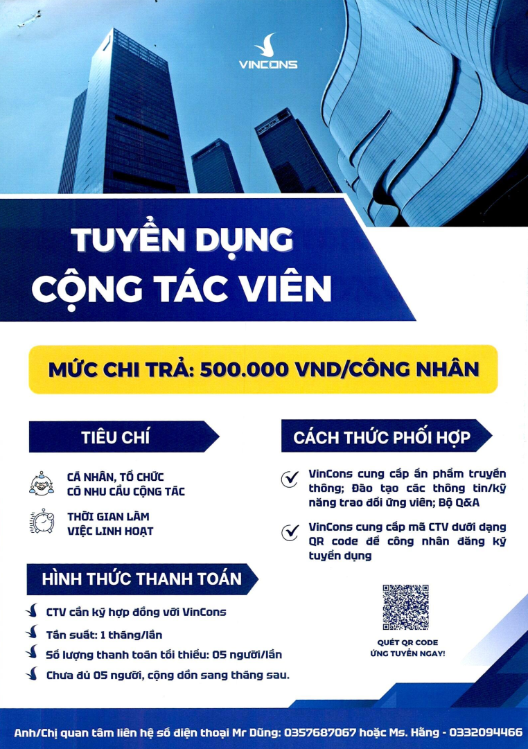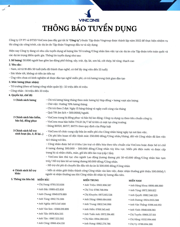 Công ty Cổ phần Phát triển & Đầu tư Xây dựng VINCONS - Thành viên Tập đoàn Vingroup, được thành lập theo Giấy chứng nhận Đăng ký doanh nghiệp số 0108172251 do Sở Tài chính thành phố Hà Nội cấp lần đầu ngày 28/02/2018. Công ty hiện là đơn vị thi công các công trình, dự án xây dựng trong hệ sinh thái Vingroup. Nhằm đáp ứng tiến độ các dự án này, Công ty đang có nhu cầu tuyển dụng số lượng rất lớn lao động phổ thông tại nhiều tỉnh/thành, cụ thể như sau:- Số lượng lao động: 50.000 người.