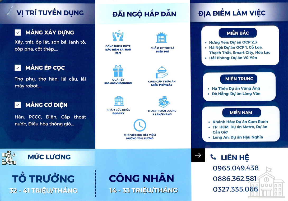 - Vị trí công việc: Lao động phổ thông và Tổ trưởng/Công nhân (tay nghề xây, trát, ốp, lát, sơn bả, cốt thép, bê tông, thạch cao, điện, cấp thoát nước, phòng cháy chữa cháv, điều hòa thông gió, hàn...) - Nơi làm việc: Hà Nội, Tp. Hồ Chí Minh, Hưng Yên, Hải Phòng, Quảng Ninh, Hà Tĩnh, Đà Nằng, Khánh Hòa, Long An,...