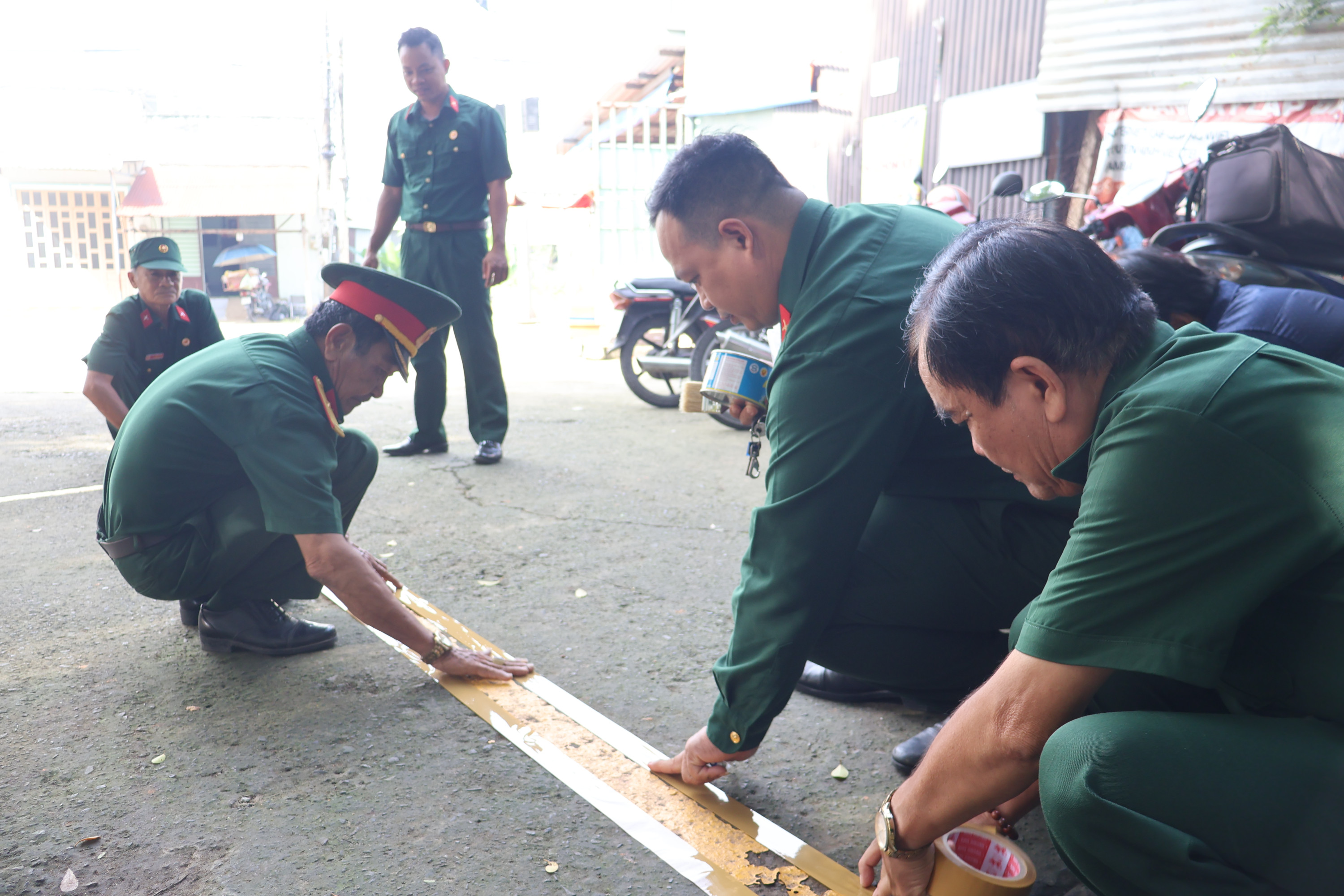 Các cựu chiến binh tiến hành sơn lại vạch kẻ phân luồng giao thông trước cổng trường bị bong tróc
