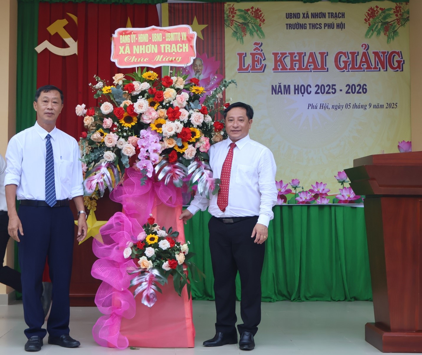 Tại Trường THCS Phú Hội, đồng chí Dương Văn Em – Phó Bí thư Thường trực Đảng ủy xã Nhơn Trạch đã dự lễ, tặng hoa chúc mừng năm học mới. Năm học 2025 – 2026, trường có 810 học sinh với 4 khối lớp; đội ngũ 35 cán bộ, giáo viên, nhân viên đều đạt chuẩn, được phân công hợp lý nhằm phát huy năng lực và sở trường. Dịp này, nhà trường đã trao tặng 47 suất học bổng, thẻ BHYT, đồng phục và tập sách cho học sinh có hoàn cảnh khó khăn, với tổng trị giá hơn 30 triệu đồng.