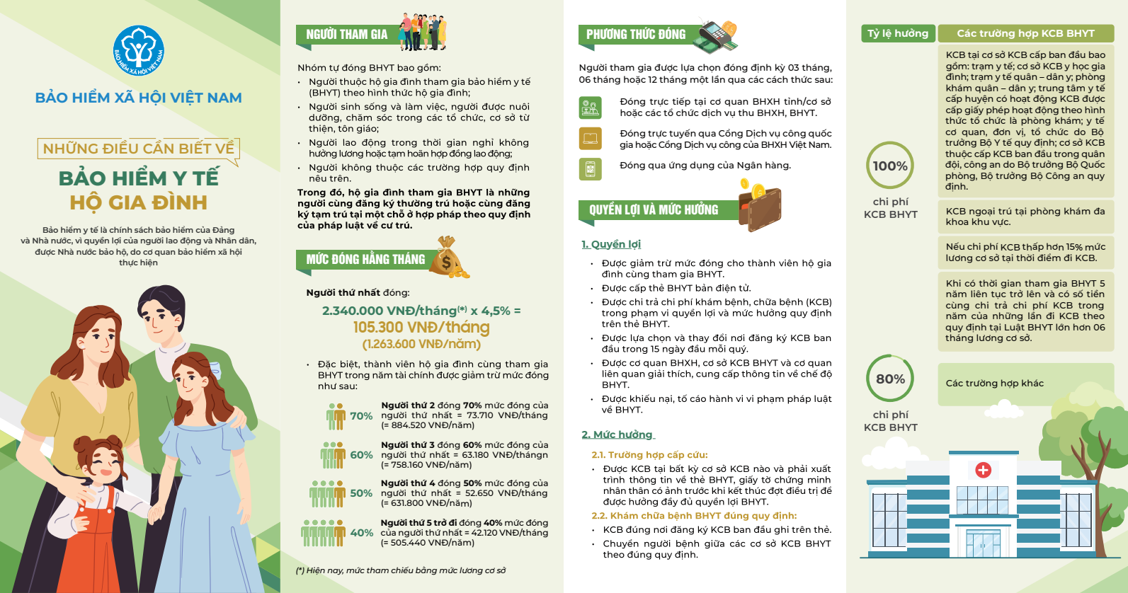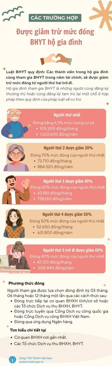 Tham gia bảo hiểm y tế theo hộ gia đình là hình thức tham gia linh hoạt, mang lại nhiều lợi ích thiết thực cho người dân. Càng nhiều người trong cùng hộ gia đình tham gia, mức đóng bảo hiểm y tế càng giảm. Người tham gia được quỹ bảo hiểm y tế chi trả từ 80% chi phí khám, chữa bệnh theo đúng mức hưởng quy định; không bị giới hạn về bệnh tật, độ tuổi, thời gian điều trị hay tổng chi phí. Đây là giải pháp bảo vệ tài chính hiệu quả, giúp người dân yên tâm chăm sóc sức khỏe, giảm gánh nặng khi không may ốm đau, bệnh tật.
