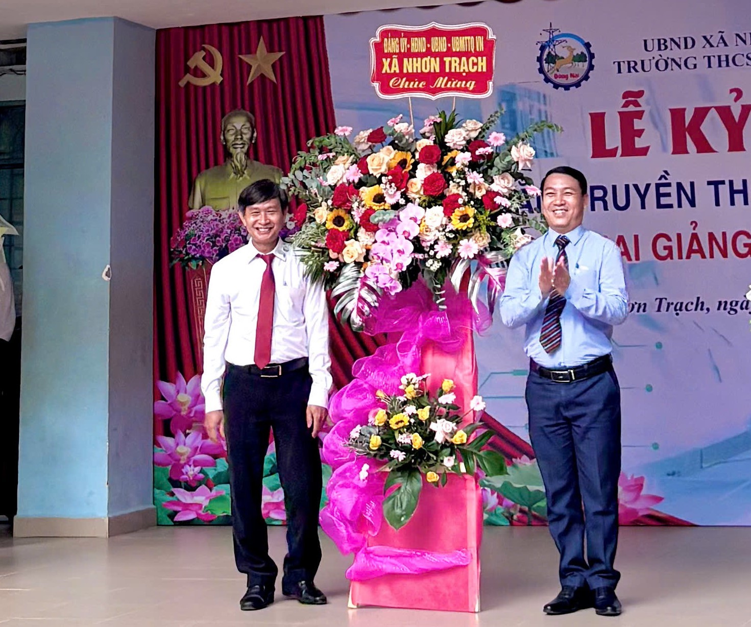 Phó Chủ tịch UBND xã Lê Ngọc Lân tặng lẵng hoa chúc mừng năm học mới tại trường THCS Phước Thiền