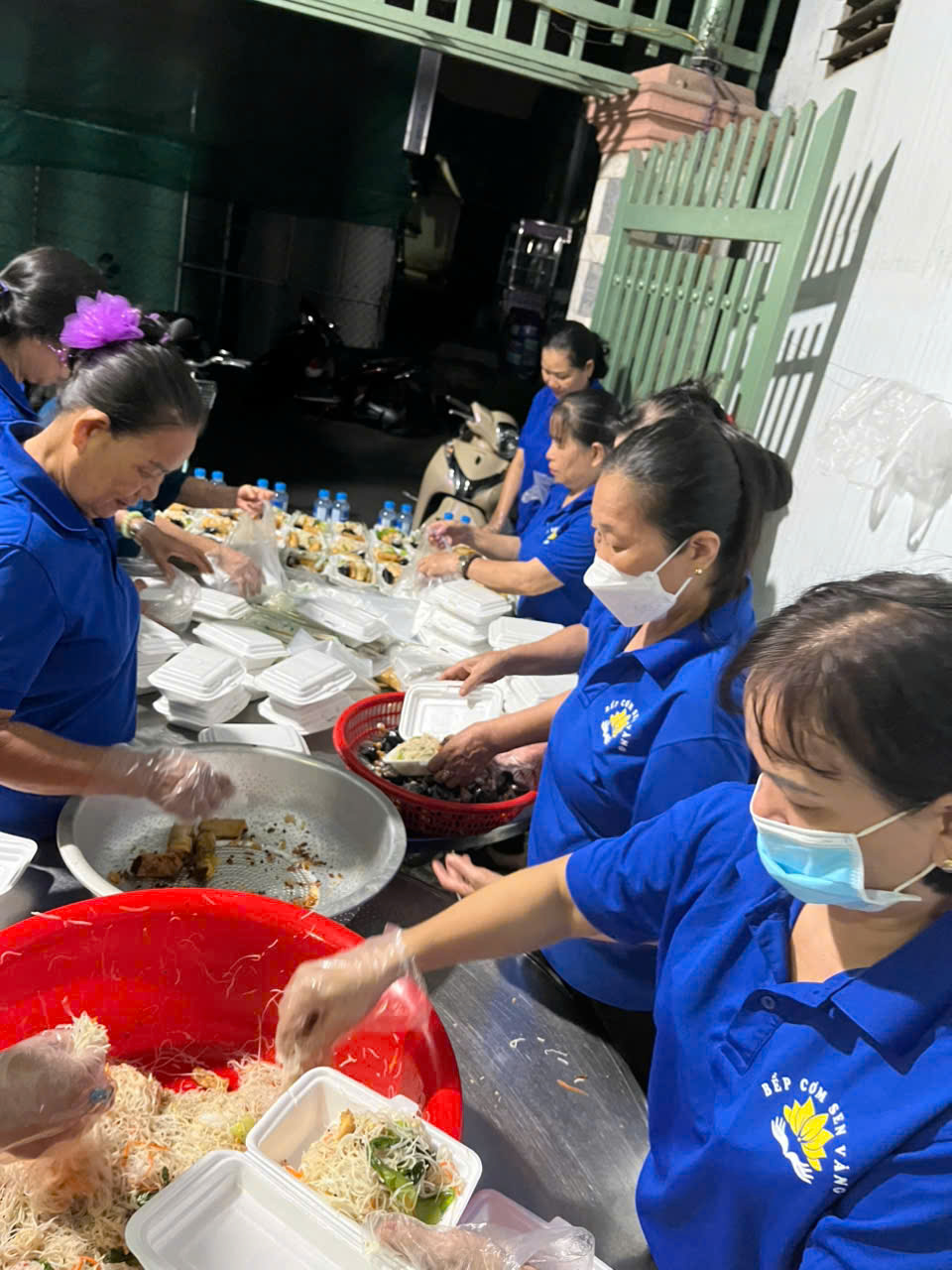 Thành viên bếp cơm Sen Vàng chuẩn bị những phần ăn tặng người lao động