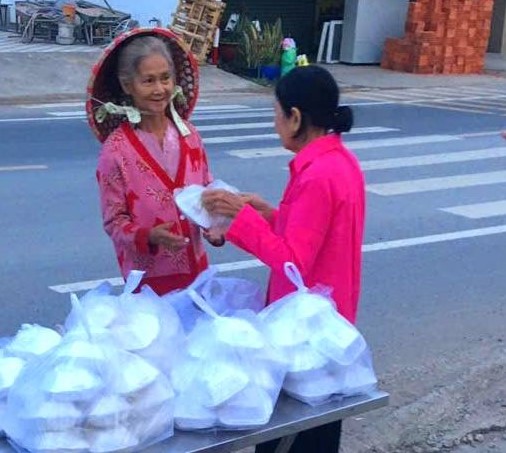 Người dân có hoàn cảnh khó khăn vui vẻ nhận phần ăn sáng miễn phí do Chi hội Phụ nữ ấp Vĩnh Tuy trao tặng