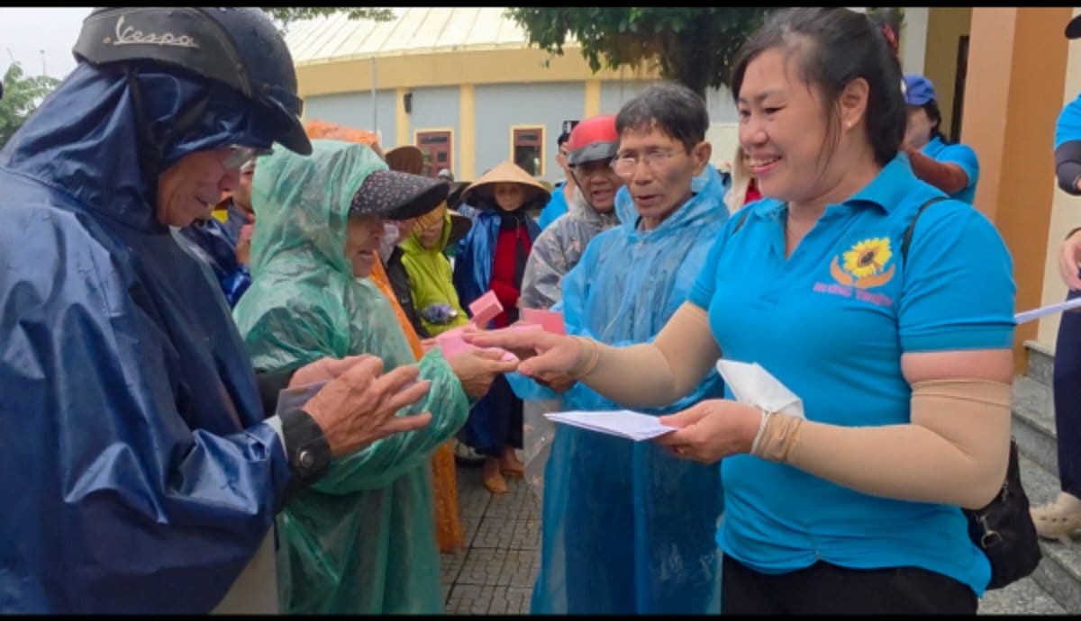Chị Thùy Vân – Trưởng nhóm Hướng Thiện trao quà hỗ trợ do nhóm vận động được đến người dân miền Trung