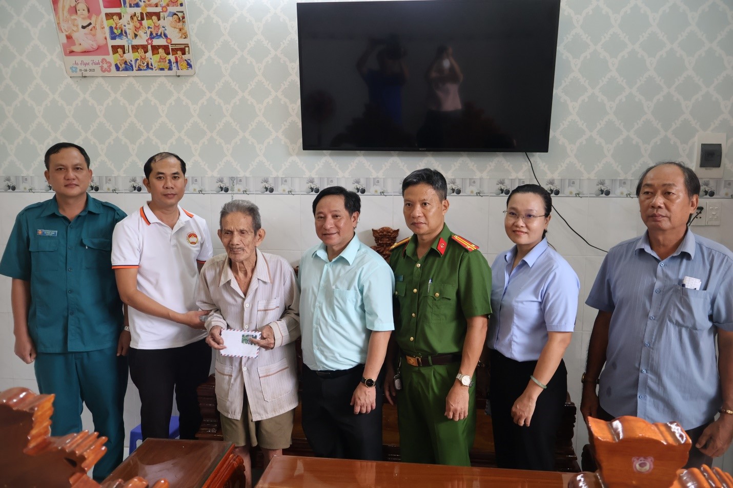 Lãnh đạo Đảng uỷ xã và các thành viên trong đoàn đến thăm và tặng quà cho gia đình chính sách tại ấp 3