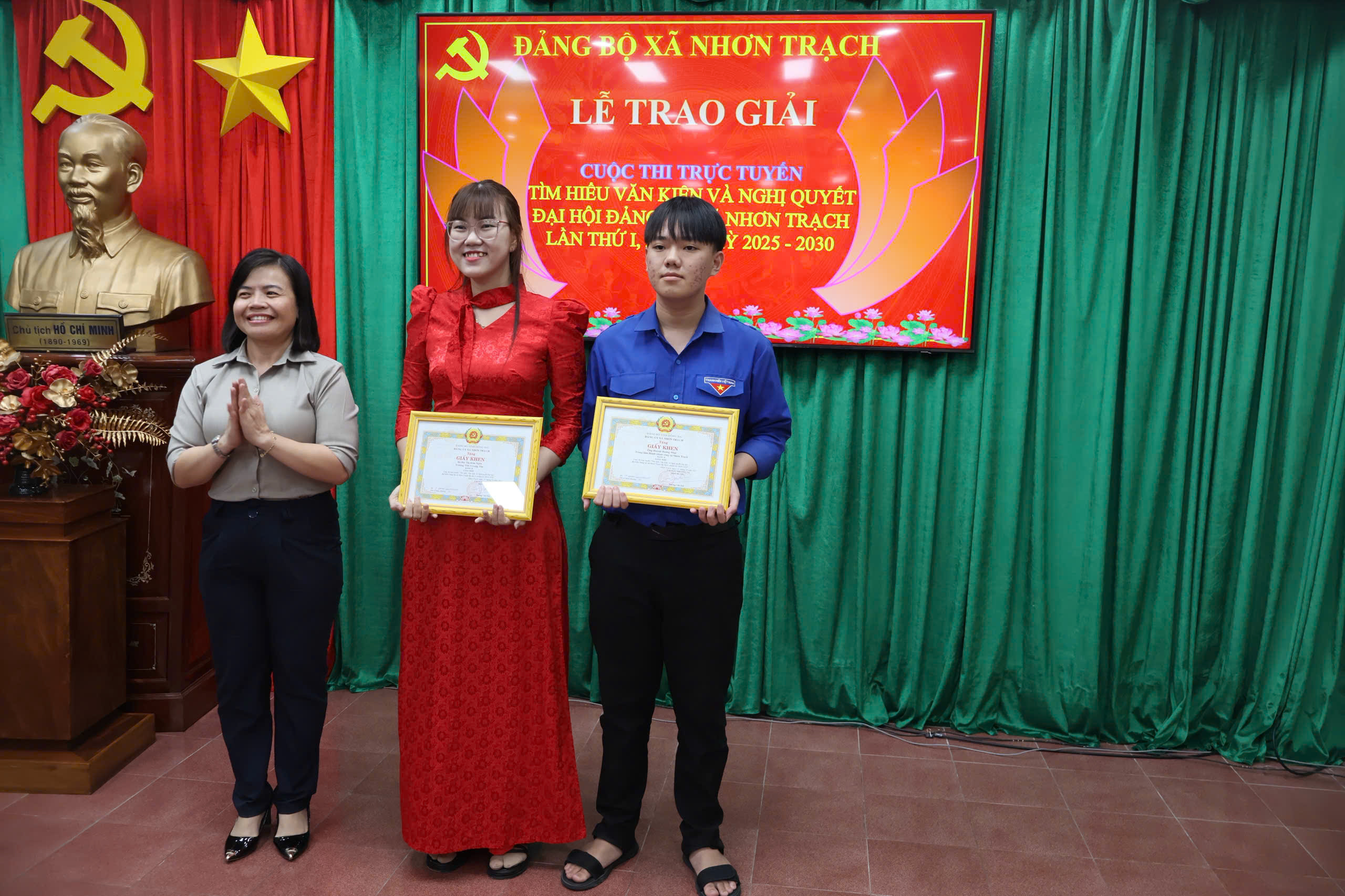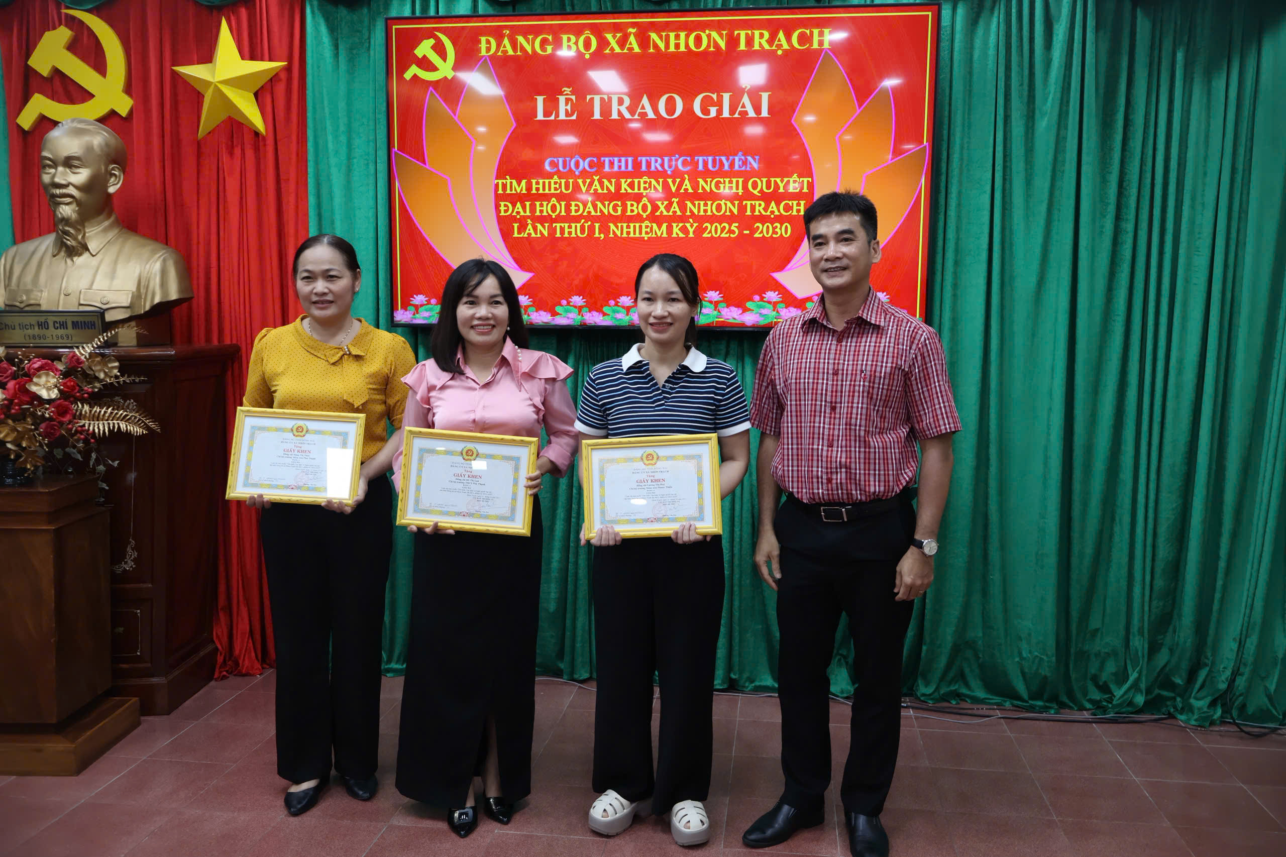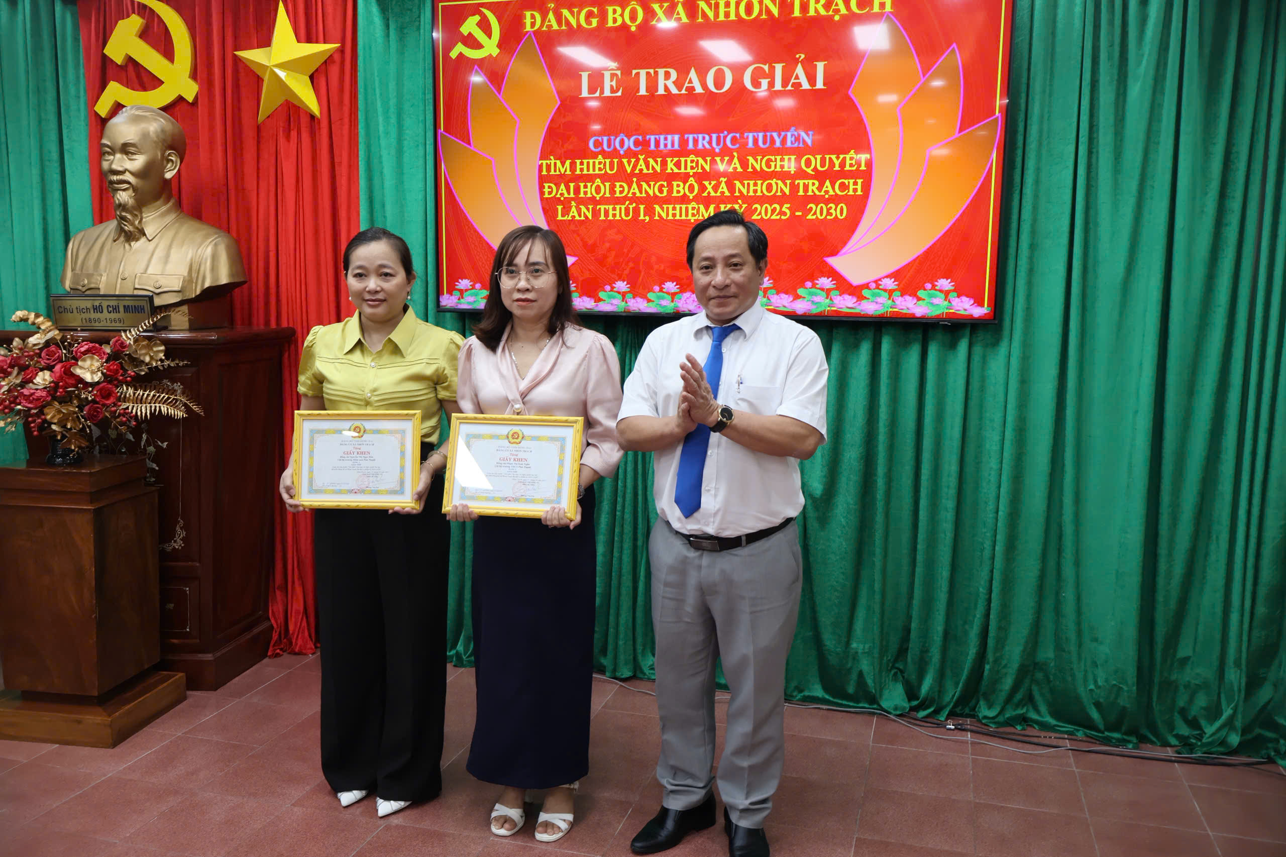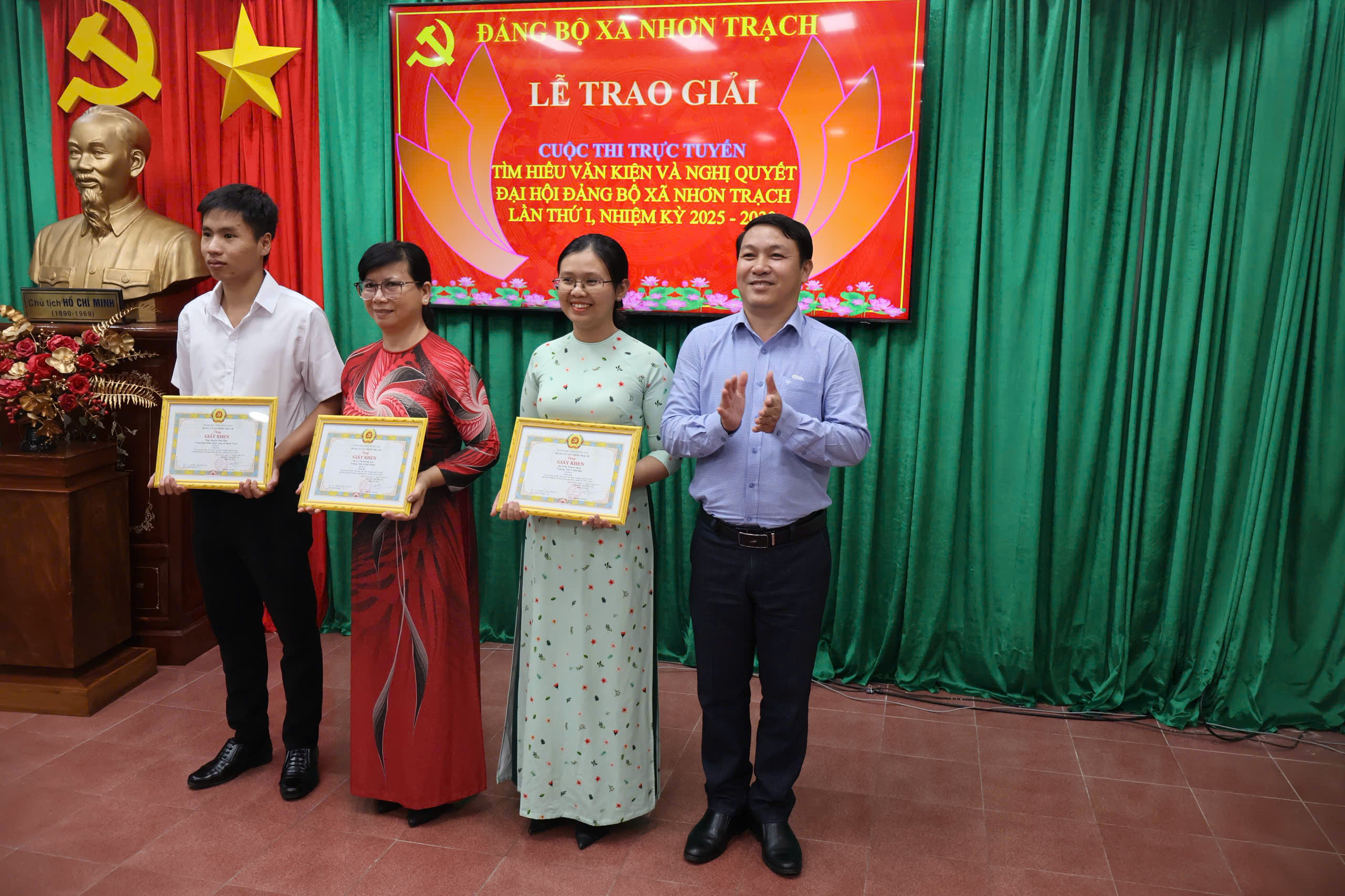 Tại buổi lễ, đồng chí Trần Minh Hoàng – Phó Ban Xây dựng Đảng Đảng ủy xã Nhơn Trạch đã trình bày báo cáo tóm tắt kết quả Cuộc thi trực tuyến, đánh giá toàn diện quá trình triển khai, tham gia và kết quả đạt được. Theo đó, Cuộc thi đã thu hút hơn 1600 cán bộ, đảng viên, đoàn viên, hội viên và Nhân dân tham gia, thể hiện tinh thần học tập nghiêm túc, trách nhiệm và nhiệt huyết với công tác tuyên truyền Nghị quyết Đại hội Đảng bộ xã. Kết quả, Ban Tổ chức đã trao thưởng cho hai bảng: Bảng A: gồm 06 đồng chí là đảng viên các chi bộ trực thuộc Đảng ủy xã có bài thi đạt thành tích cao, cụ thể: Giải Nhất: Đồng chí Nguyễn Túy Phượng đảng viên Chi bộ trường THCS Phước Thiền; Giải Nhì: Đồng chí Nguyễn Thị Ngọc Hân đảng viên Chi bộ trường Mầm non Phú Thạnh; đồng chí Phạm Thị Kim Ngân đảng viên Chi bộ trường THCS Phú Thạnh; Giải Ba: Đồng chí Hồ Thị Lan đảng viên Chi bộ trường THCS Phú Thạnh, đồng chí Lương Thị Huệ đảng viên Chi bộ trường Mầm non Phước Thiền, đồng chí Đặng Thị Thảo đảng viên Chi bộ Trường Mầm non Phú Thạnh. Bảng B: dành cho các cá nhân là đoàn viên, hội viên và Nhân dân có kết quả xuất sắc, cụ thể: Giải Nhất: Bà Lê Thị Thương - Công ty TNHH Thương Mại Hải Minh; Giải Nhì: ông Huỳnh Hoàng Nhật cán bộ cơ quan Trung tâm phục vụ Hành chính công xã Nhơn Trạch; bà Bùi Thị Kim Ngân giáo viên trường THCS Long Tân; Giải Ba: ông Nguyễn Nhật Huy cán bộ cơ quan Trung tâm phục vụ Hành chính công xã Nhơn Trạch; bà Lý Thị Hương Lan giáo viên trường THCS Hiệp Phước; bà Trần Thanh Thùy giáo viên trường THCS Phú Hội.
