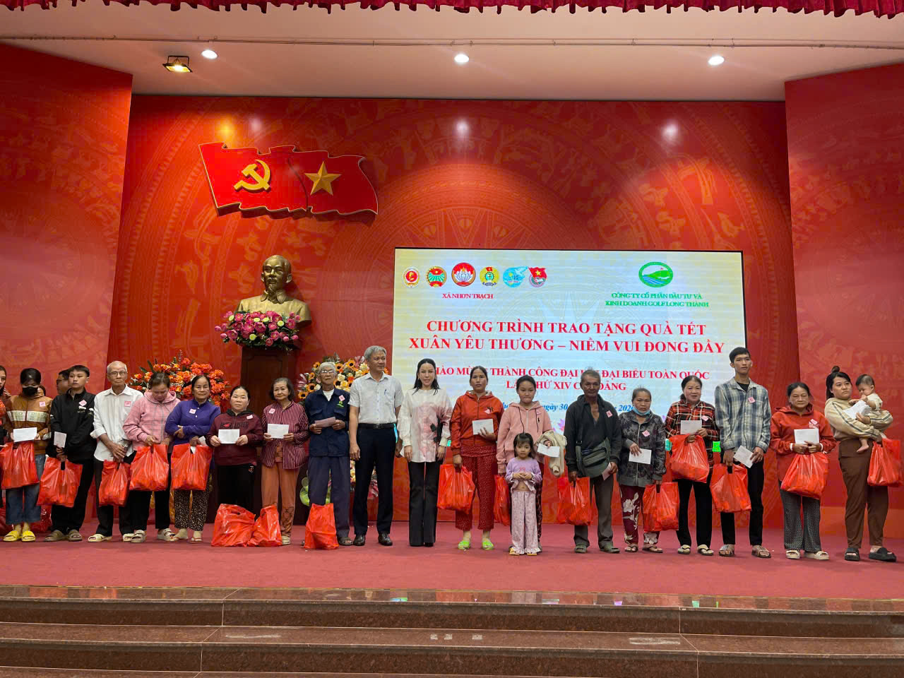 Thực hiện Chương trình công tác của Ủy ban Mặt trận tổ quốc Việt Nam xã năm 2026 về chăm lo hộ nghèo, cận nghèo, hộ khó khăn trên địa bàn xã Nhơn Trạch là một trong những nhiệm vụ trọng tâm của Đảng ủy - HĐND - UBND - Ủy ban MTTQ Việt Nam xã. Chào mừng thành công Đại hội đại biểu toàn quốc lần thứ XIV của Đảng, mừng Xuân Bính Ngọ năm 2026. Chiều ngày 30/01/2026 tại Hội trường Đảng uỷ - Cơ quan Ủy ban Mặt trận Tổ quốc Việt Nam xã Nhơn Trạch phối hợp với công ty Cổ phần đầu tư và kinh doanh Golf Long Thành tổ chức chương trình “Xuân yêu thương - Niềm vui đong đầy” mừng xuân Bính Ngọ 2026, trao quà Tết cho các hộ gia đình có hoàn cảnh khó khăn trên địa bàn xã.
